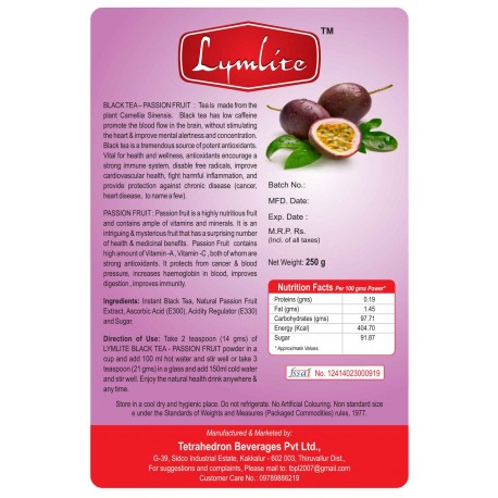 Its made from the plant camellia sinensis. Black tea has low Caffeine Promote the blood flow in the brain, without stimulating the heat & improve mental alertness and concentration. Black tea is a tremendous source of potent antioxidants. Vital for health and wellness, antioxidants encourage a strong immune system, disable free radicals, improve cardiovascular health, fight harmful inflammation, and provide protection against chronic disease (cancer, heart disease, to name a few). Passion Fruit is a nutritious fruit and contain sample of vitamins and minerals. Its an intriguing & mysterious fruit that has a surprising number of health & medicinal benefits. Its contains high amount of vitamin - A, vitamin - C, both of whom are strong antioxidants. It protects from cancer & blood pressure, increase haemoglobin in blood, improves digestion, improve immunity.