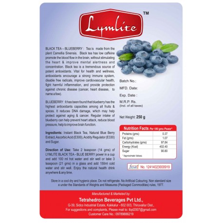 Its made from the plant camellia sinensis. Black tea has low Caffeine Promote the blood flow in the brain, without stimulating the heat & improve mental alertness and concentration. Black tea is a tremendous source of potent antioxidants. Vital for health and wellness, antioxidants encourage a strong immune system, disable free radicals, improve cardiovascular health, fight harmful inflammation, and provide protection against chronic disease (cancer, heart disease, to name a few). It has been found that blueberry has the highest antioxidants capacities among all fruits & spices. It reduces against againg & cancer. Regular intake of blueberry can help prevent heart attack, reduce blood pressure, help to improve brain function .